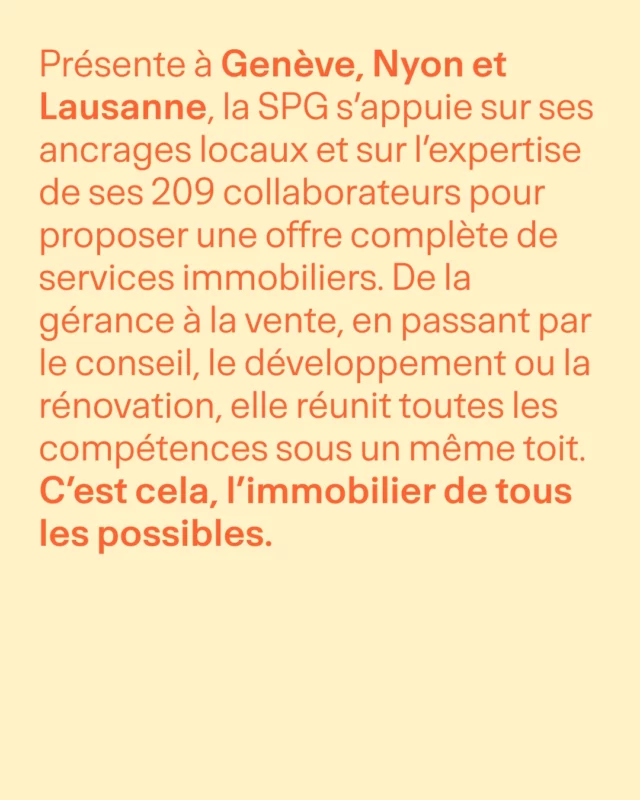 Acteur incontournable de l’immobilier en Suisse romande depuis trois générations, la SPG s’appuie sur son ancrage local et l’expertise de ses 230 collaborateurs. Nous vous accompagnons dans vos projets immobiliers quels qu’ils soient.