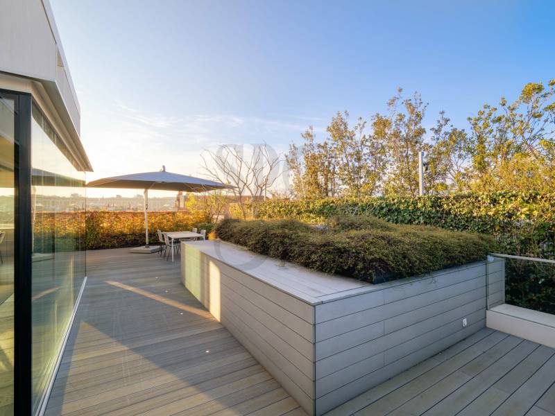 Green terrace, panoramic rooftop, double garage, and private parking space.