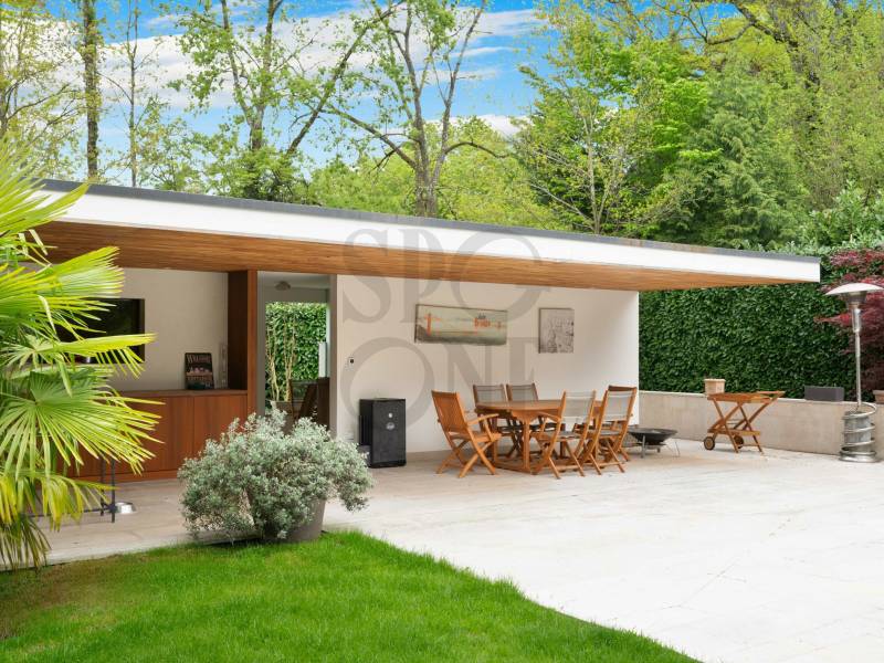 Externally, the carefully landscaped garden hosts a 14 × 6 m heated swimming pool, a pool house with summer kitchen and barbecue, as well as a wellness area with sauna, shower and changing room. An independent cottage with bathroom and kitchenette completes this rare ensemble.