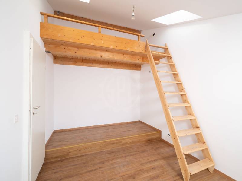 Une mezzanine avec espace bureau + rangement sous pente.