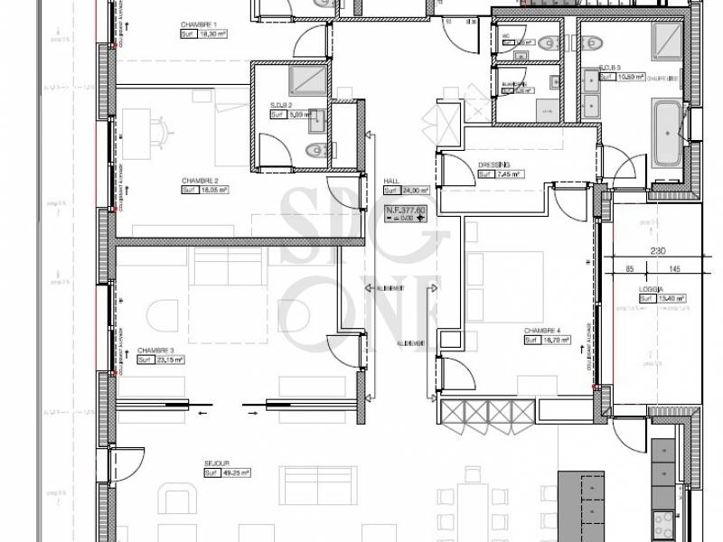 Un hall d’entrée, une magnifique cuisine entièrement équipée ouverte sur le séjour salle à manger, prolongés d’une terrasse (isolation phonique) avec un vue panoramique spectaculaire,