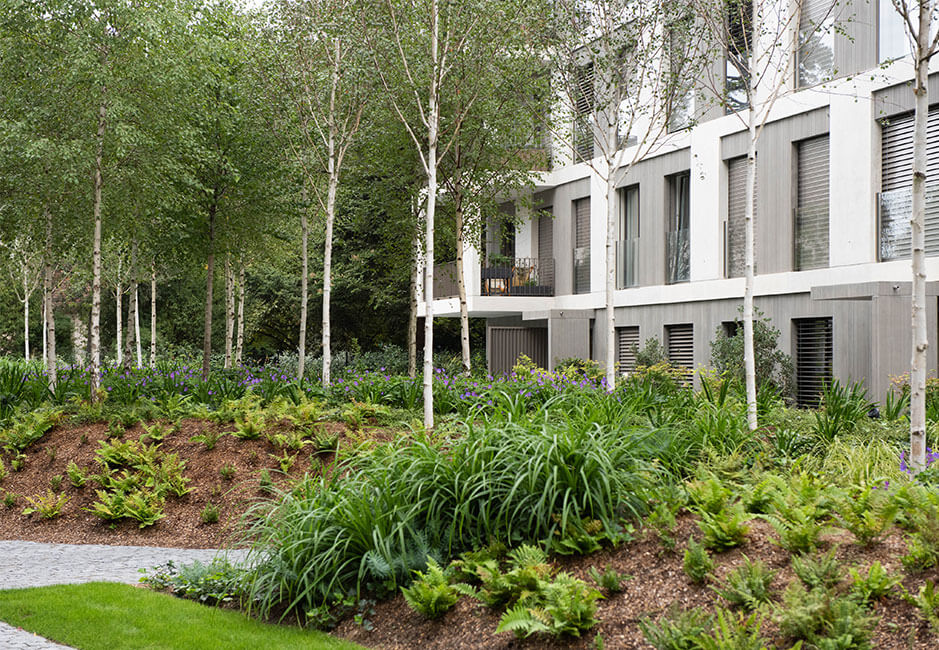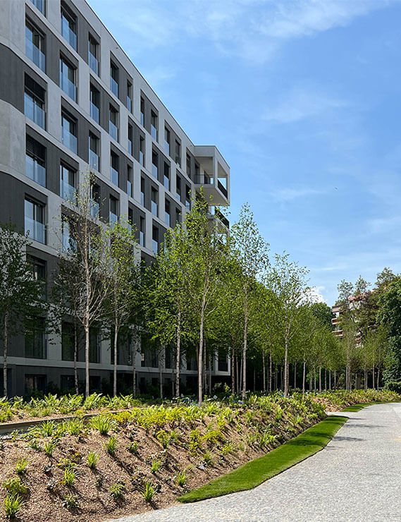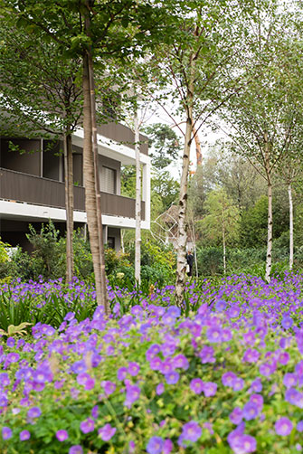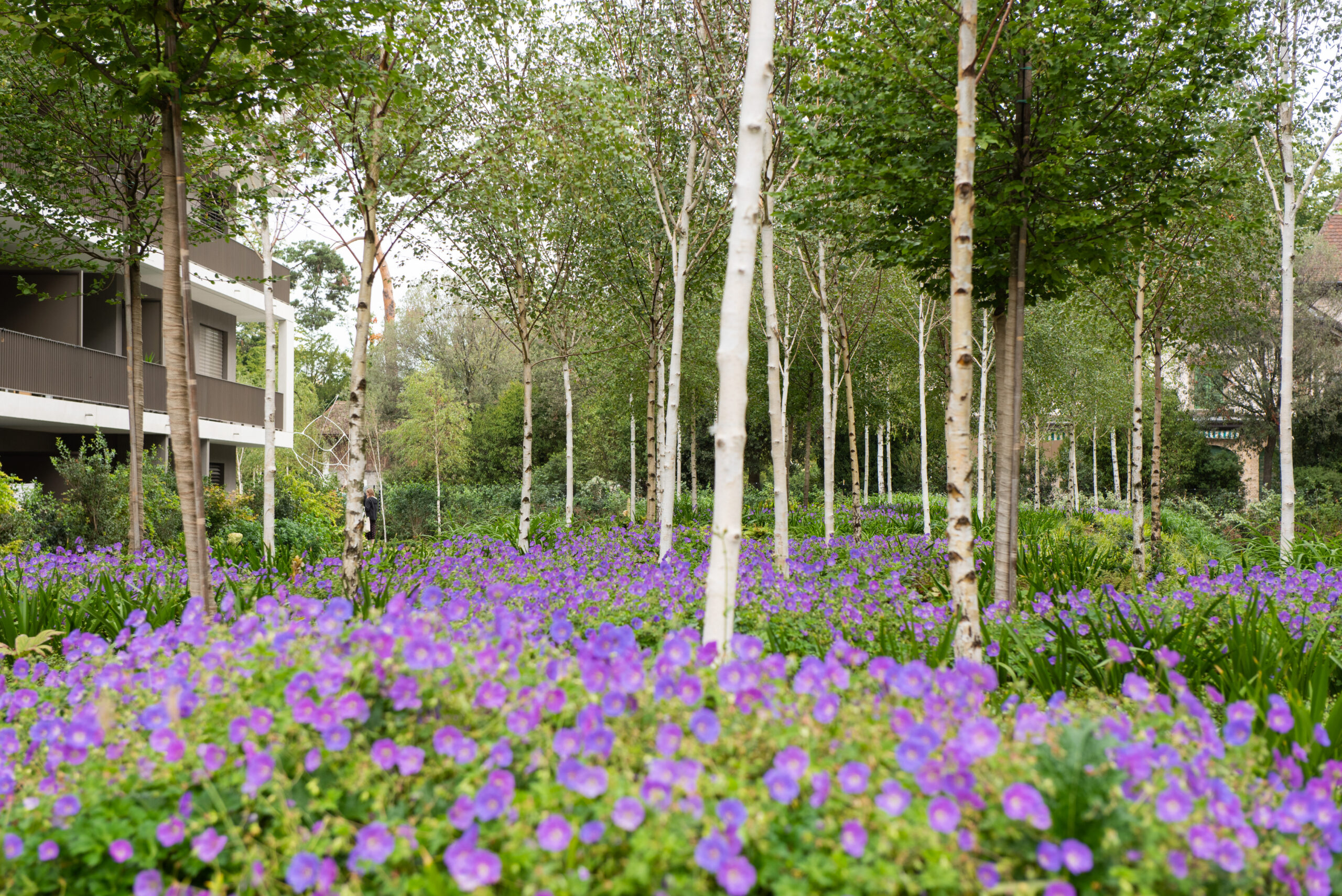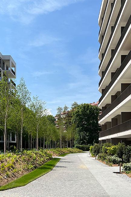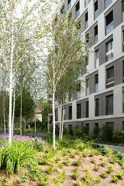 Pour ce projet aux aménagements paysagers d’exception, le maître d’ouvrage, appuyé du pilote, a initié un concours international, remporté par le bureau parisien Michel Desvigne. Situé dans un parc arboré, cet ensemble se distingue par des aménagements extérieurs imaginés par Michel Desvigne. Plus de 200 bouleaux ont été plantés pour offrir aux résidents un environnement verdoyant.