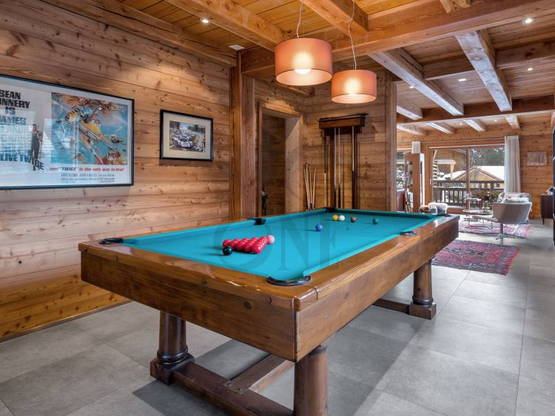 Le chalet dispose de 4 à 5 chambres spacieuses, 4 salles de bains luxueuses, un salon cathédrale avec cheminée, ainsi qu’une cuisine ouverte adjacente à une salle à manger conviviale. Une cave à vin facilement convertible en un hammam et une salle de billard ajoutent au charme de cette demeure d’exception.