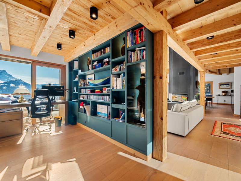 Les espaces de vie, largement ouverts grâce à d’imposantes baies vitrées, bénéficient d’une luminosité remarquable et s’ouvrent sur un panorama spectaculaire des Alpes vaudoises.