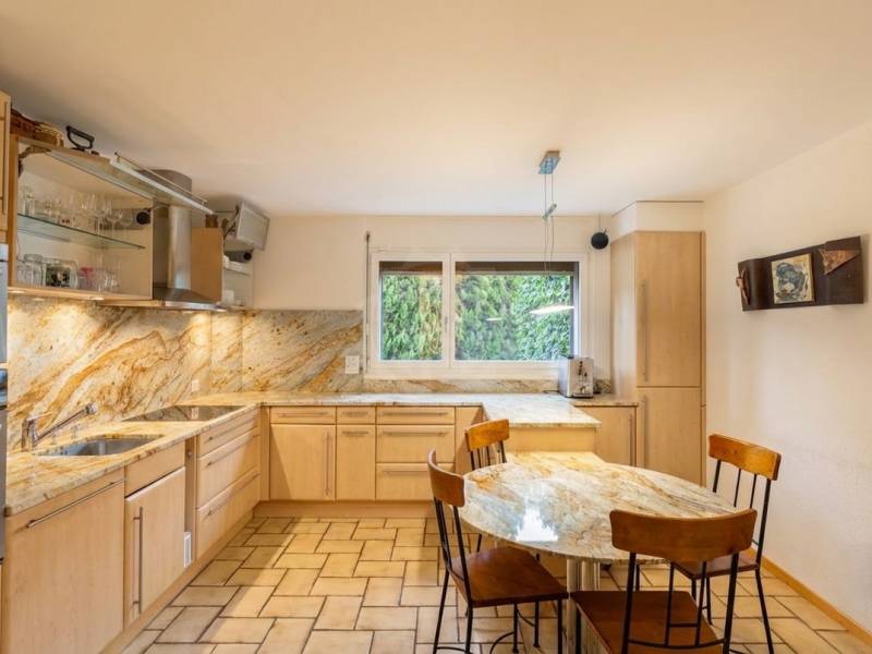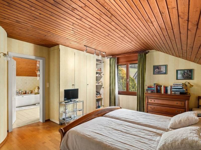 La maison développe environ 300 m² de surface utile et se distingue par ses volumes généreux (cubage d’environ 1’138 m³) ainsi que par une distribution intérieure fonctionnelle, laissant place à de nombreuses possibilités d’aménagement. Les espaces de vie bénéficient d’une belle luminosité, d’un chauffage au sol assurant un confort optimal, et s’ouvrent sur une agréable véranda, véritable prolongement de l’espace intérieur.