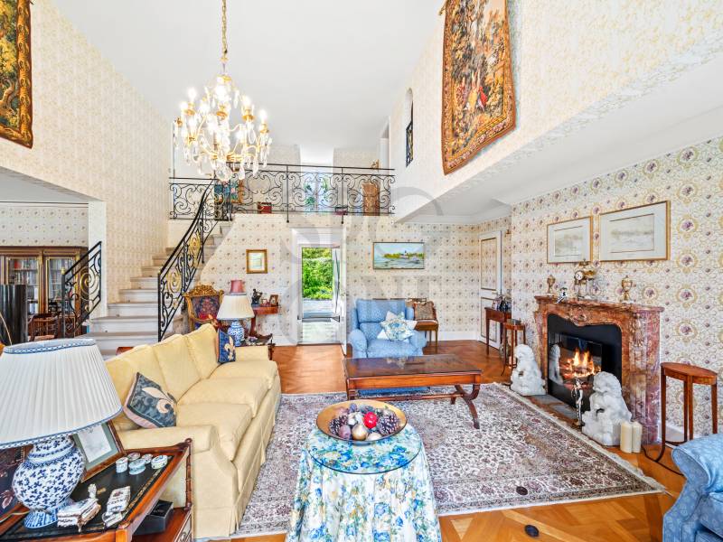 Le vaste séjour, sublimé par une cheminée d'époque, une belle hauteur sous plafond et de superbes ouvertures sur le jardin, invite à la détente comme à la réception.