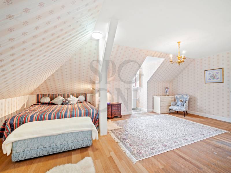 A l’étage, une mezzanine surplombant le séjour confère une perspective aérienne et élégante. La partie nuit comprend quatre chambres confortables ainsi que trois salles de bains. Un grand espace sous les combles, actuellement non aménagé, offre un potentiel supplémentaire pour une salle de jeux, un atelier ou un espace de loisirs.