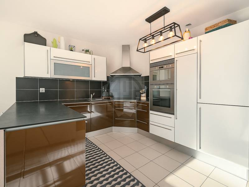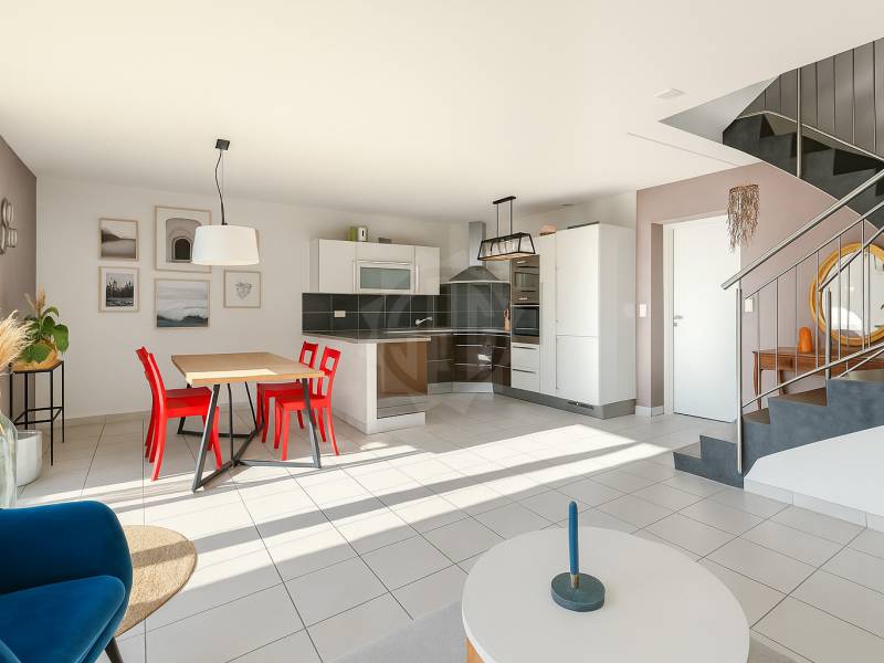 Au rez-de-chaussée, une grande entrée accueille les visiteurs. Cet espace, pouvant aisément être utilisé comme deuxième salon ou salle TV, dessert une salle de douche supplémentaire ainsi qu’une belle pièce de vie lumineuse comprenant une cuisine ouverte sur le séjour, avec accès direct à la terrasse et au jardin.