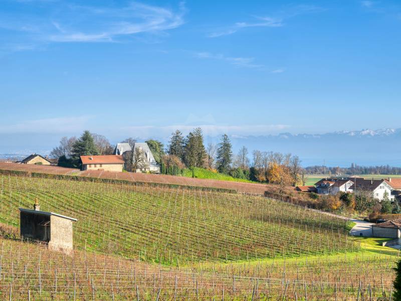 Cette villa individuelle à rénover bénéficie d’une situation exceptionnelle, nichée entre vignes et lac, offrant une vue panoramique spectaculaire sur le Léman et les Alpes.
