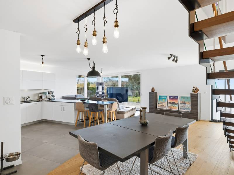 Dès l’entrée, le ton est donné : parquet en bois massif, finitions soignées et volumes généreux créent une atmosphère chaleureuse et raffinée. Le vaste espace de vie s’articule autour d’une cuisine ouverte aux lignes épurées, particulièrement spacieuse et pensée comme un véritable lieu de convivialité. Son plan de travail généreux permet aussi bien les repas sur le pouce que les moments partagés en famille. Le séjour, sublimé par un escalier et garde-corps en verre, s’ouvre harmonieusement sur la terrasse orientée plein sud, offrant une luminosité exceptionnelle tout au long de la journée. Ce niveau accueille également un espace bureau ou salle de sport, une salle de douche avec WC ainsi qu’un local technique, complétant parfaitement la fonctionnalité des lieux.