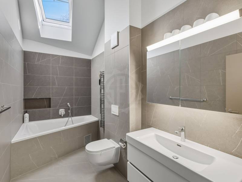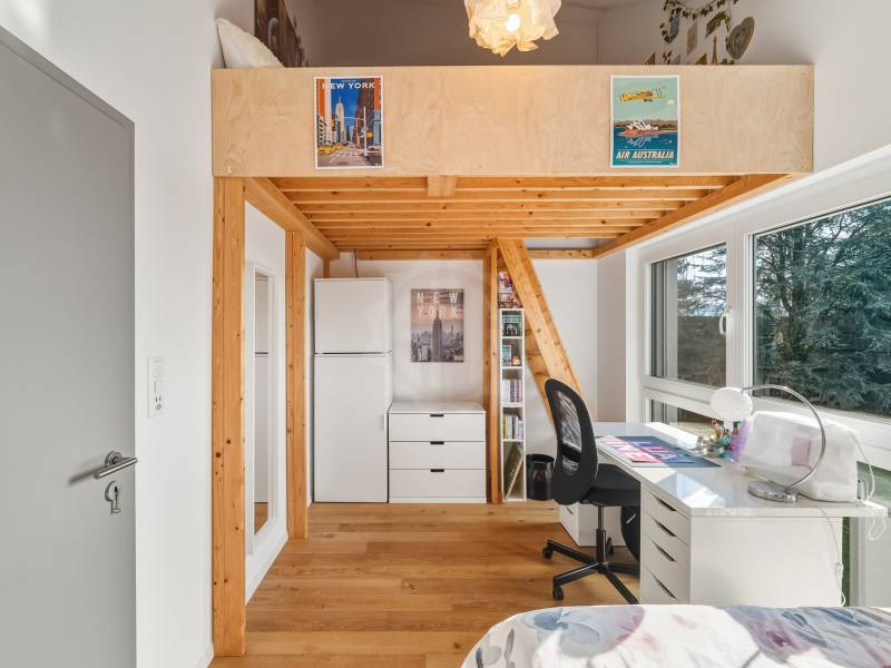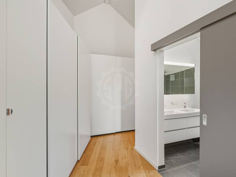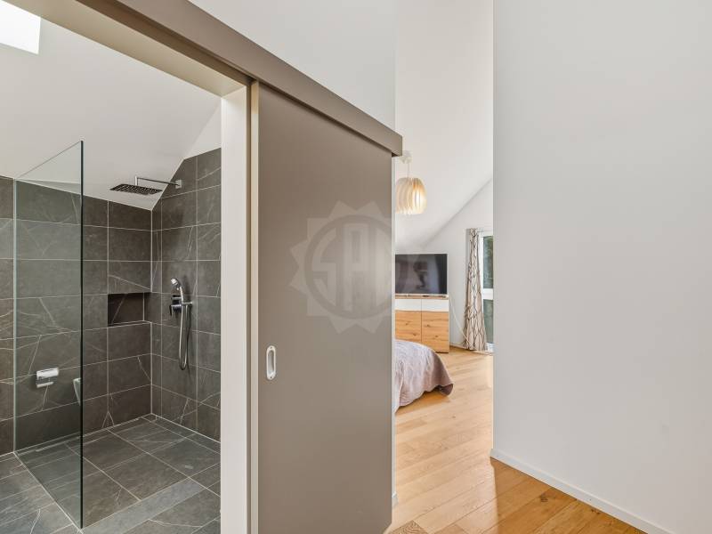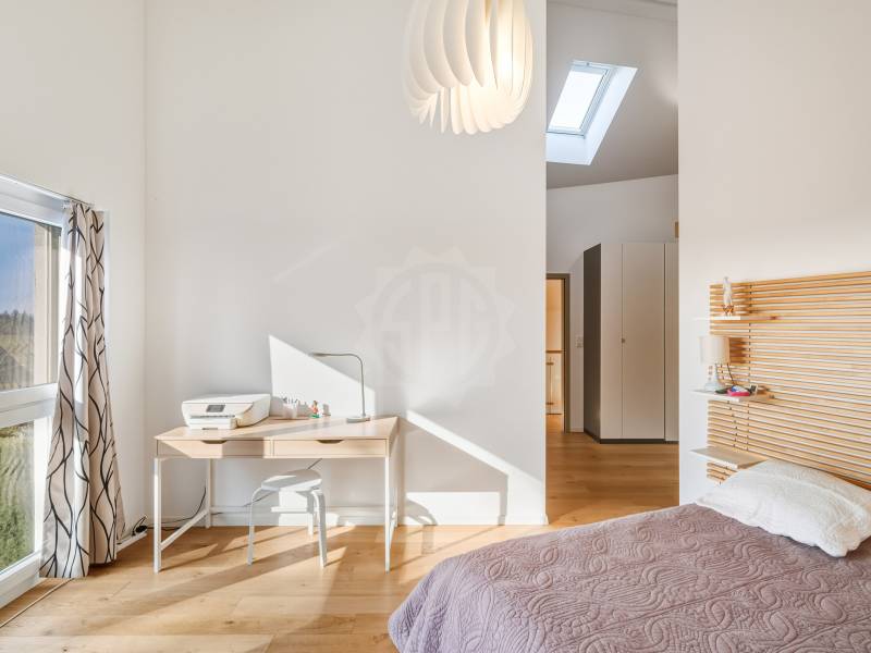 À l’étage, le sentiment d’espace est immédiat grâce à une belle hauteur sous plafond, conférant un cachet rare à l’ensemble. L’espace nuit se compose de quatre chambres aux volumes généreux, dont une superbe suite parentale, avec salle de douche privative et espace dressing, un luxe rare. Une chambre disposant d’un balcon et d’une entrée indépendante apporte une flexibilité supplémentaire. Une seconde salle de bains luxueuse, équipée d’une baignoire balnéo, vient parfaire ce niveau, pensé pour le confort et le bien-être de toute la famille.