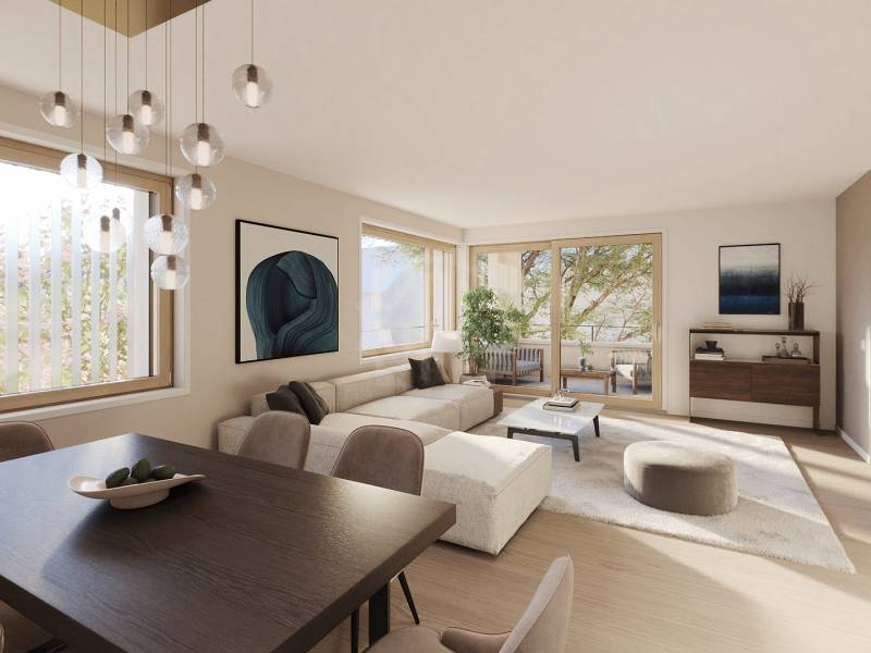 Cet appartement offre une surface PPE de 87.90 m², avec une loggia. Il se compose d’une entrée menant à une cuisine moderne, ouverte sur la salle à manger et le salon. Ce niveau comprend également une chambre parentale et une salle de bains.