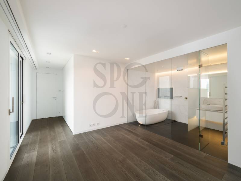 L’appartement comprend également une suite parentale avec une salle de bain attenante, une douche, des WC et un dressing spacieux. Une chambre à coucher avec balcon et salle de bains attenante, ainsi qu’une troisième chambre avec salle de douche attenante et WC.