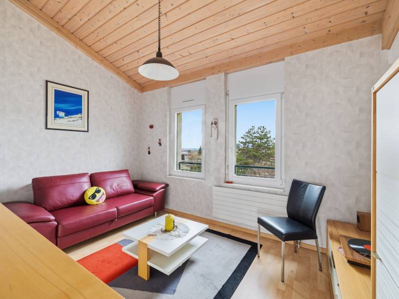 Le premier niveau de ce logement, de 94.30 m2 PPE, est occupé par un grand et lumineux séjour agrémenté d’une cheminée, une cuisine équipée, deux chambres à coucher, et une salle de douche.