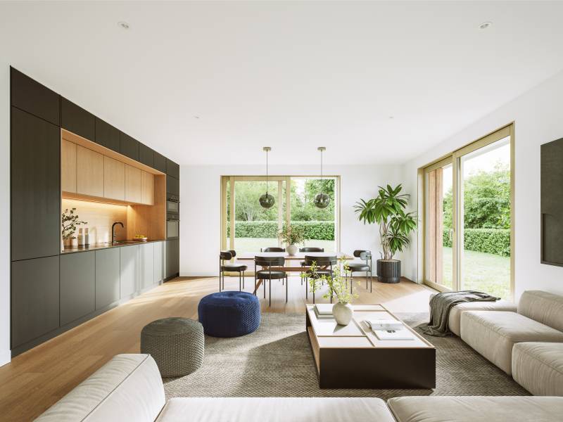 Le rez-de-chaussée accueillera une pièce de vie d’environ 30 m² regroupant la cuisine et le séjour, avec un accès direct à une terrasse ainsi qu’à un jardin privatif de 443 m². L’espace nuit comprendra une chambre principale avec salle de douche privative, deux autres chambres, ainsi qu’une salle de bains avec w.-c. Le niveau inférieur abritera plusieurs espaces fonctionnels : une salle de sport, une salle de douche, une buanderie et une cave.