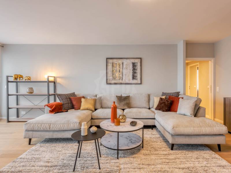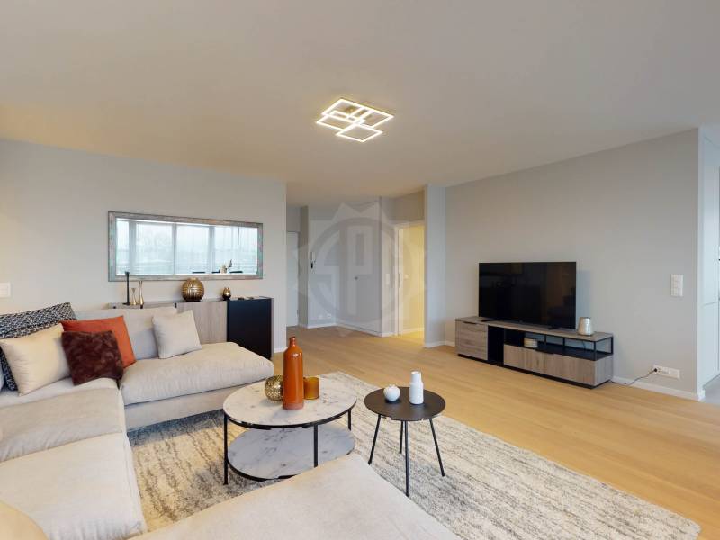 L’entrée, desservie par un accès privatif par ascenseur, mène à une vaste pièce de vie pourvue de larges baies vitrées avec vue sur le Salève. Cette pièce comprend un élégant salon / salle à manger et une cuisine contemporaine ouverte entièrement équipée.