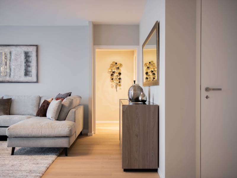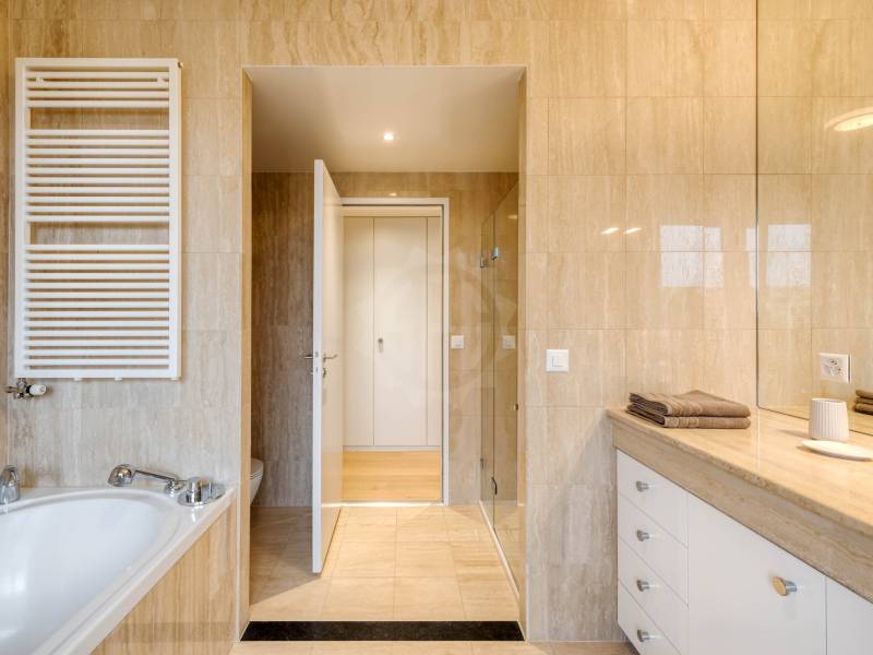 L’appartement propose deux espaces nuit bien distincts. Le premier accueille une spacieuse suite parentale avec armoires murales, une salle de bains attenante équipée d’une baignoire et d’une douche, ainsi que des w.-c. séparés. L’ensemble dispose d’un accès à un premier balcon de 10,7 m2.