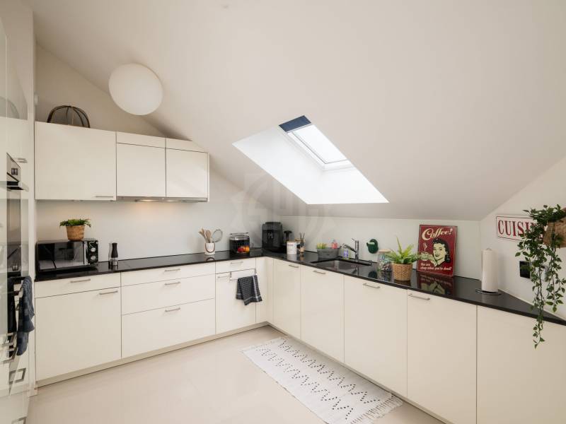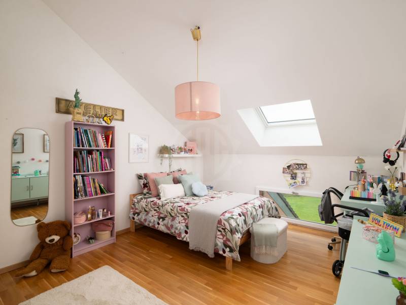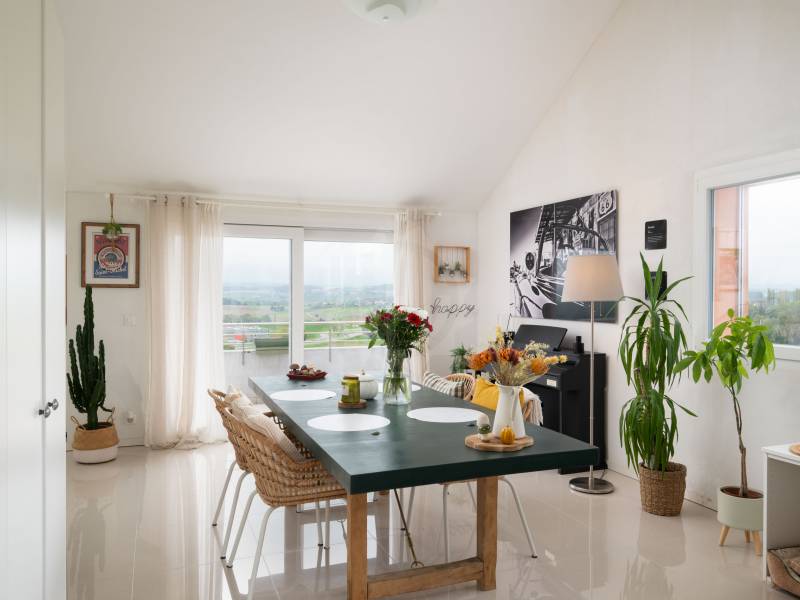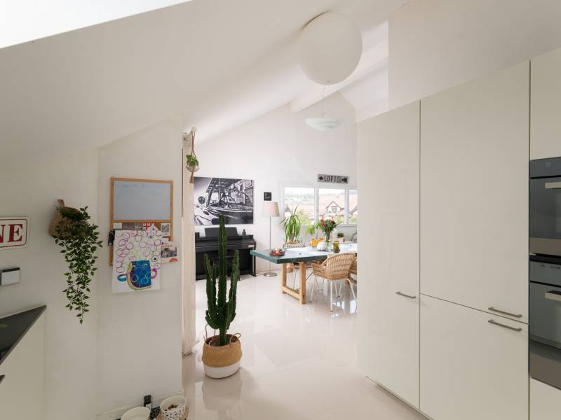 Niché au sommet d’un immeuble récent de 2016 et labelisé Minergie, ce magnifique attique de 4.5 pièces offre une surface généreuse de 122 m2 habitables. Les finitions sont très soignées et les matériaux employées de bonne facture. La cuisine ouverte sur le séjour est entièrement équipée avec des appareils électro-ménagers récents et qualitatifs. La partie jour de l’appartement offre un espace séjour et cuisine somptueux avec une hauteur sous plafond atteignant 4 mètres. Cet espace s’ouvre d’une part sur la vaste terrasse de plus de 50 m2 avec espace de rangement côté est et d’autre part sur le balcon d’environ 8 m2 côté ouest. L’espace est baigné de lumière et offre une vue dégagée sur la campagne environnante.