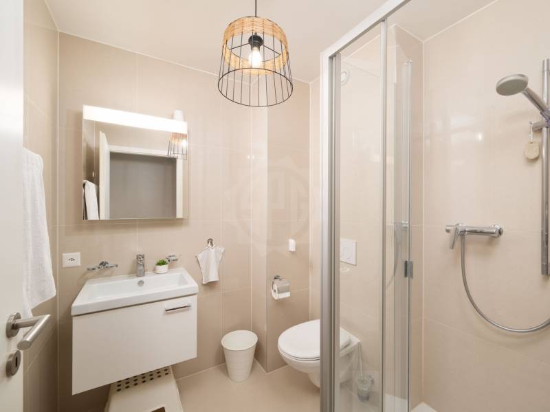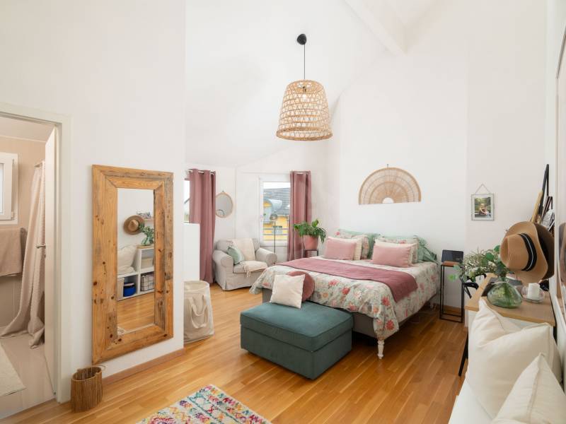 De l’autre côté de l’appartement, nous retrouvons l’espace nuit qui est fermé par une porte et permet ainsi une totale intimité. Ce sont 3 chambres à coucher dont une grande suite parentale avec sa salle d’eau qui sont à disposition. Les deux autres chambres, plus petites, disposent également de leurs salles d’eau personnelles. Bien que mansardé, l’appartement présente des volumes agréables.