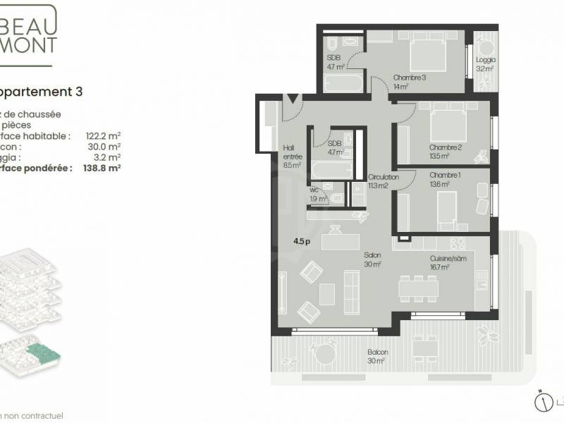 D’une surface PPE de 138.8 m², il séduit par ses volumes généreux et ses espaces extérieurs confortables, avec un balcon de 30 m² complété par une loggia de 3.2 m², parfaits pour profiter des beaux jours en toute tranquillité.