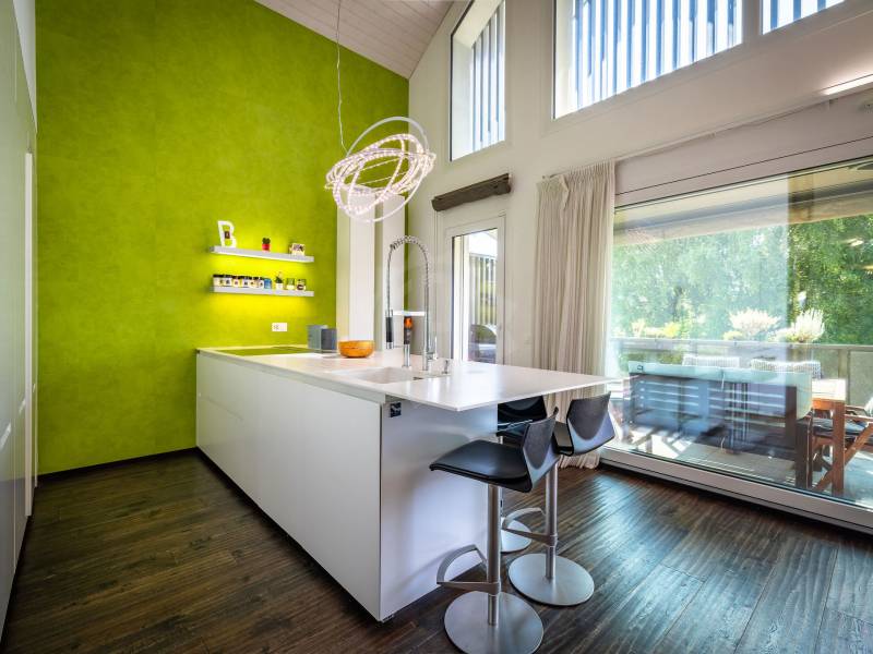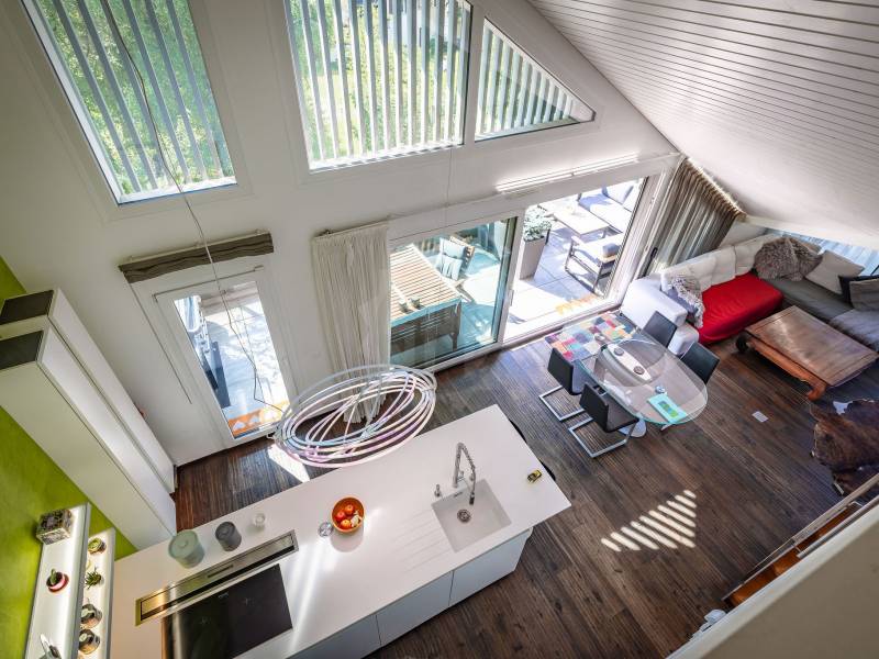 Le coeur de l’appartement accueille un vaste séjour avec cuisine ouverte, mis en valeur par une impressionnante hauteur sous plafond de 5 mètres. Cet espace convivial s’ouvre sur une grande terrasse et un balcon filant, assurant un accès extérieur privé à chaque chambre et préservant l’intimité des occupants. Le parquet fumé de type « Shou Sugi Ban », les spots encastrés et les baies vitrées à triple vitrage créent une atmosphère à la fois chaleureuse, contemporaine et inondée de lumière.