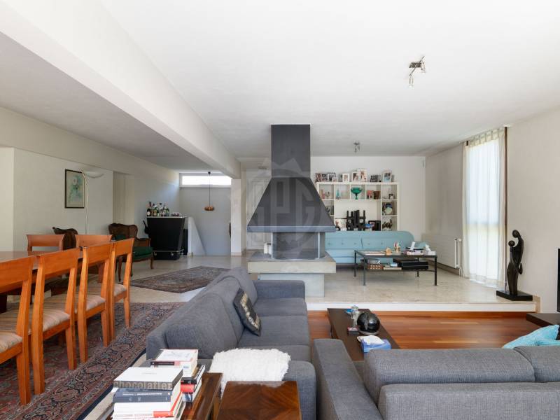 L’espace de vie principal se compose d’un hall d’entrée menant à une cuisine fermée, puis à un vaste salon/salle à manger baigné de lumière naturelle. Le séjour est sublimé par une cheminée centrale, apportant une atmosphère chaleureuse et conviviale.