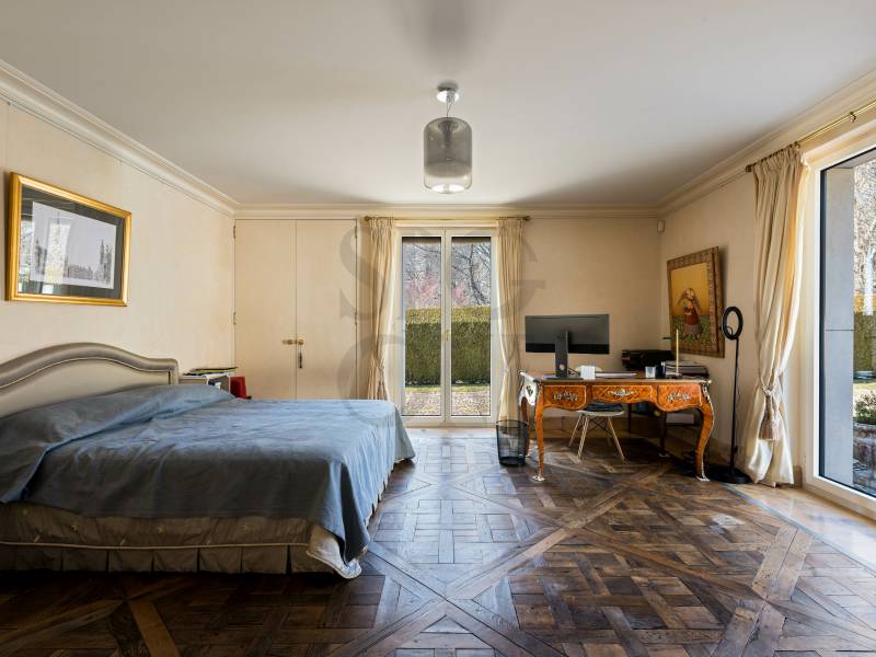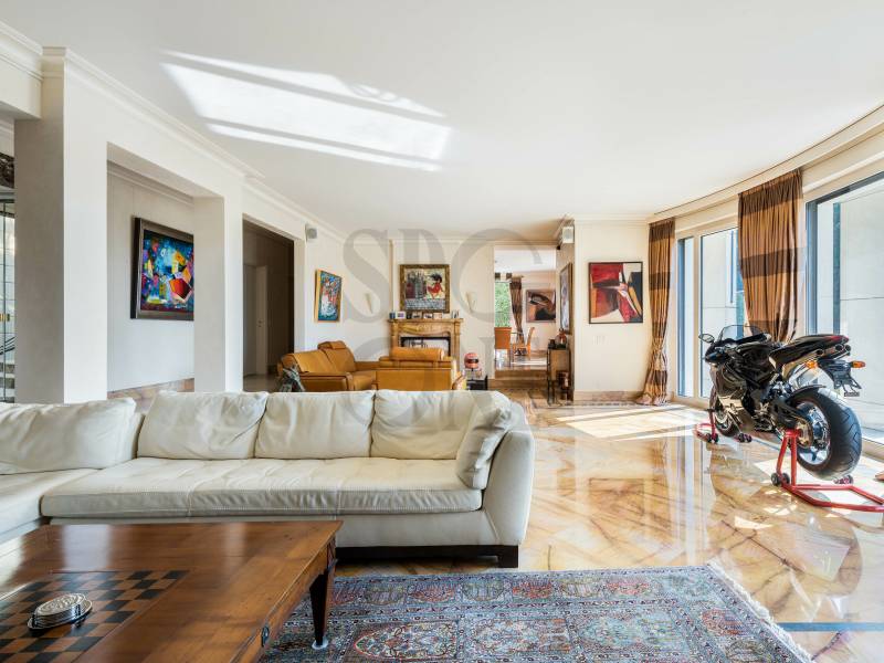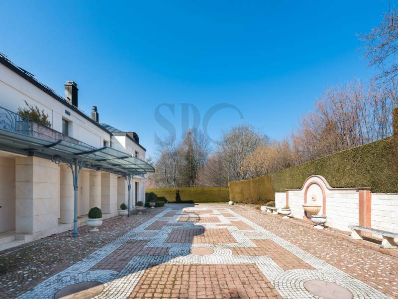 Le charme opère dès l’arrivée, où un imposant portail électrique s’ouvre sur une belle allée menant à une grande cour. Dessiné par l’architecte de renom Gabriele Rossi, ce véritable chef-d’œuvre de plus de 690 m2 habitables se distingue par son entrée majestueuse et son escalier à double révolution.