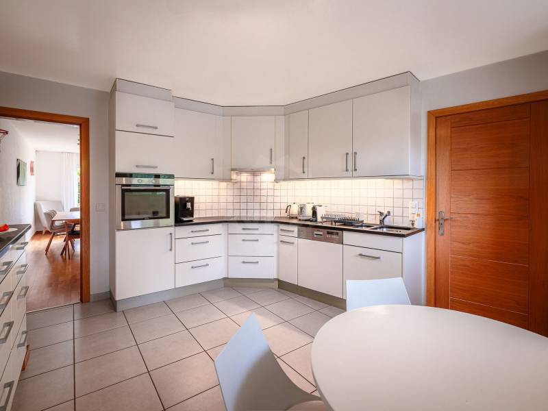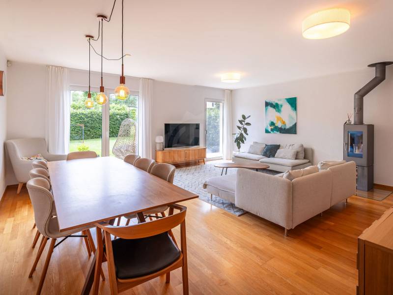 - Rez-de-chaussée : hall d’entrée avec rangements intégrés, vaste séjour lumineux avec poêle à bois et accès direct à la terrasse et au jardin, cuisine fermée entièrement équipée, WC visiteurs